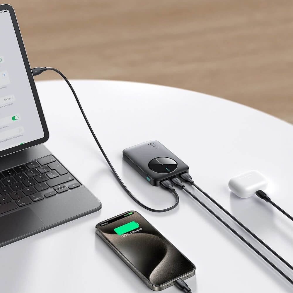 Моделът разполага с два USB-A изхода и един USB-C порт, което позволява зареждане на до три устройства едновременно. USB-C портът служи както за вход, така и за изход, осигурявайки удобство и универсалност.
